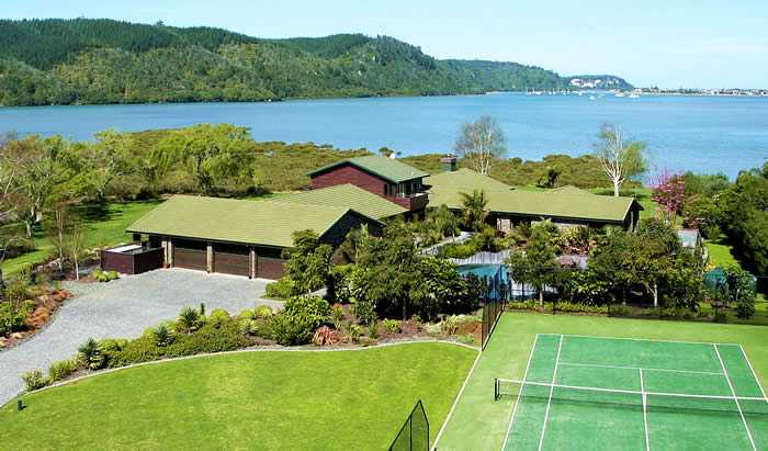 a small headland on the shores of the Whangamata Harbour, this large lodge styled home